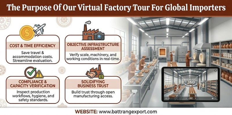 A virtual tour provides an immersive, remote inspection of our manufacturing workspace utilizing high-definition video broadcasts and interactive digital mapping. Bat Trang Ceramic Factory implements this advanced technological solution to build absolute trust and operational transparency with our international B2B partners. This specialized digital experience delivers several distinct commercial advantages: