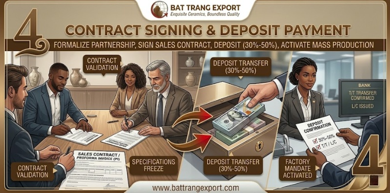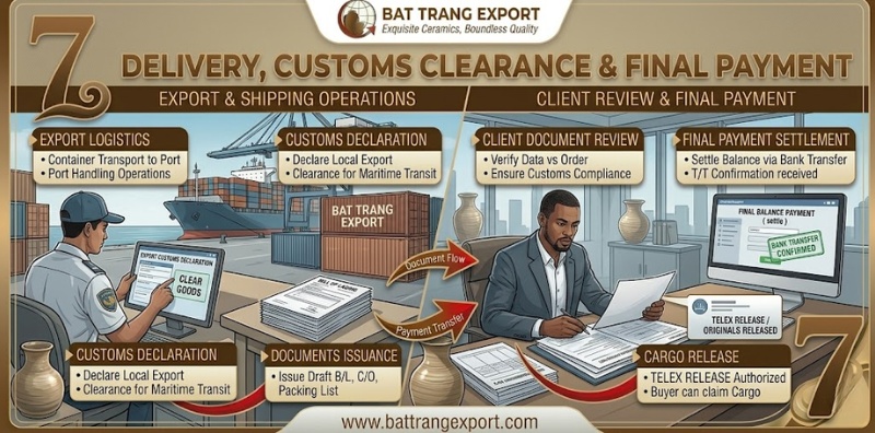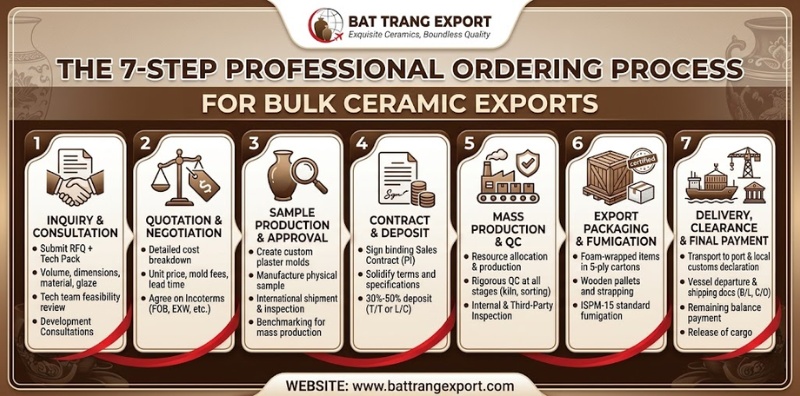 Adhering to a highly structured ordering process guarantees that international B2B buyers receive premium, fully compliant ceramics on schedule. By executing every step meticulously, from the initial technical consultation to the final customs clearance, your supply chain remains transparent and fully optimized. Contact Bat Trang Export Factory today with your technical specifications to receive a competitive quotation and start your customized manufacturing project.