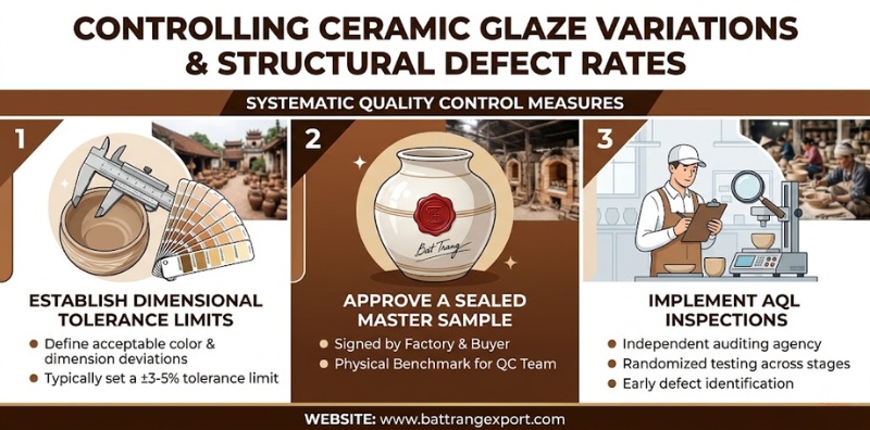 - Implement AQL (Acceptable Quality Limit) Inspections: Hire an independent auditing agency to conduct randomized AQL testing across multiple stages of the complete Bat Trang ceramic manufacturing process, ensuring that early defect identification—from the initial bisque firing to the final glaze application—forces the manufacturer to execute immediate corrective actions before mass carton packaging.
