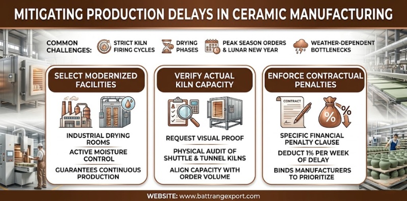 Ceramic production fundamentally resists rapid acceleration because it depends entirely on strict kiln firing cycles and greenware drying phases. Furthermore, placing massive commercial orders during peak sourcing seasons or directly before the Lunar New Year inevitably triggers severe lead time delays.