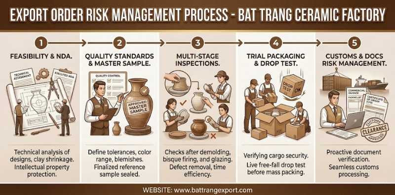 With over 15 years of experience managing ceramic production and exporting to highly regulated markets like Japan and Europe, we have developed a highly effective risk management protocol. This structured system does not just react to problems as they arise, but actively neutralizes them directly at the source.