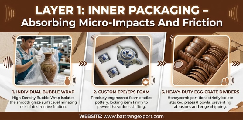 The fundamental principle of fragile logistics dictates that ceramic items must never physically touch each other. Therefore, establishing a reliable internal protective barrier systematically absorbs continuous mechanical vibrations during turbulent ocean transit.