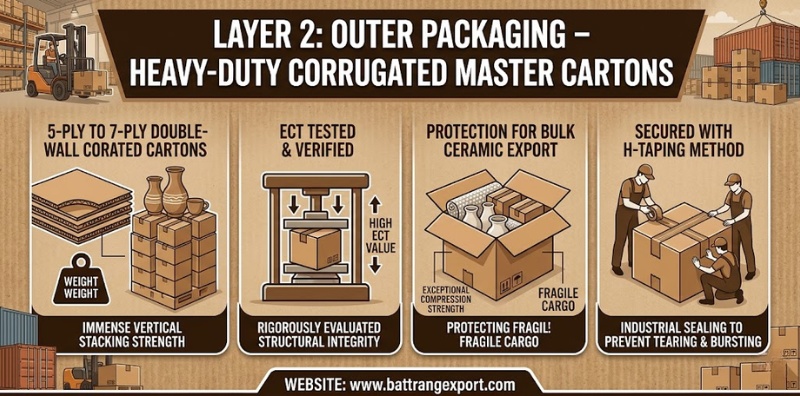 The external master carton must independently support immense vertical weight when stacked tightly inside a commercial shipping container. Therefore, utilizing 5-ply to 7-ply double-wall corrugated cartons remains an absolute necessity to secure all bulk ceramic export shipments.